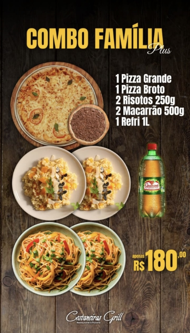Ideal para 4 pessoas! Este Combo acompanha: 2 Pizzas Grandes + 2 Risotos 250g + 2 Massas 250g + 1 Pizza Broto.